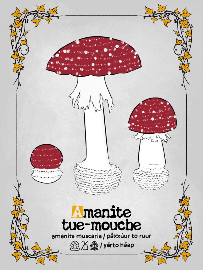 Noms : amanite tue-mouche / amanita muscaria [latin] / páxxúur to ruur [castellain humain : cailleuse de sang] / yárto háap [transcription du castellain classique : navires de mort]